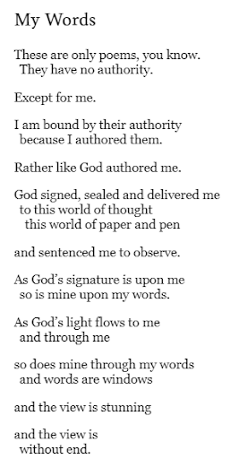 Below, a poem from her book that, I’ll admit, is one of my all-time favorites from the new collection for obvious, self-serving reasons, “My Words”: